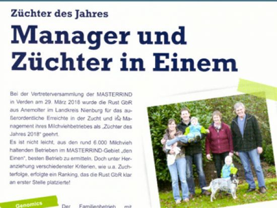 Bei der Vertreterversammlung der MASTERRIND in Verden am 29. März 2018 wurde die Rust GbR aus Anemolter im Landkreis Nienburg für das außerordentliche Erreichte in der Zucht und im Management ihres Milchviebetriebes als "Züchter des Jahres 2018" geehrt.